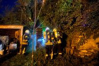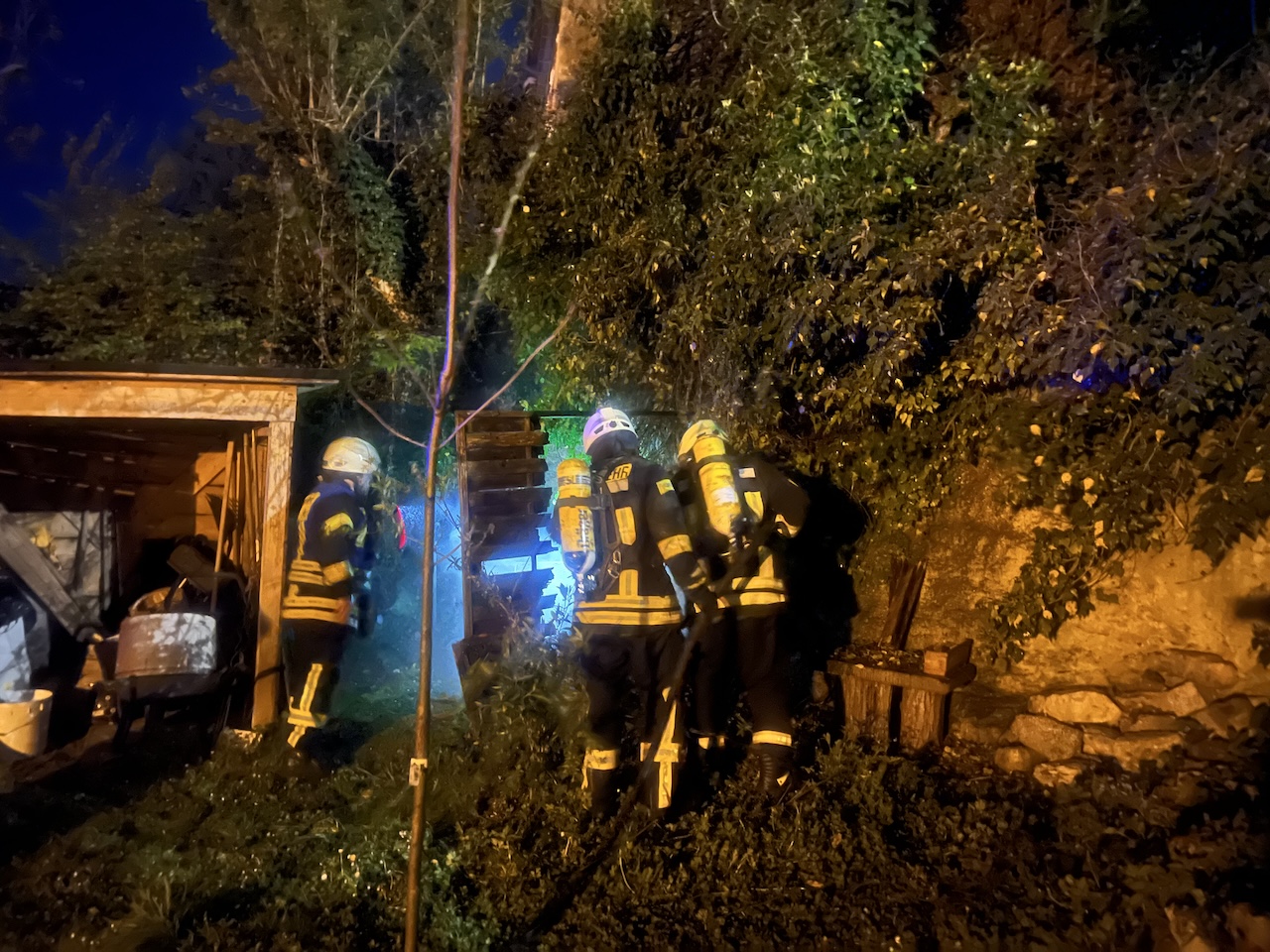 Beim Eintreffen der ersten Kräfte brannte eine Holztrennwand sowie eine von oben überhängende Efeuhecke aus bislang ungeklärter Ursache. Ein Trupp unter Atemschutz nahm umgehend das erste Rohr mittels Schnellangriff des Löschgruppenfahrzeugs (LF 16/12) vor und konnte das Feuer schnell unter Kontrolle bringen. Durch das zügige Eingreifen wurde eine weitere Ausbreitung auf angrenzende Bereiche verhindert.