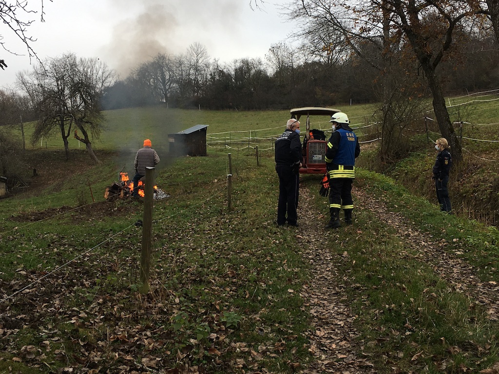 Bereits auf der Anfahrt war die Rauchwolke gut sichtbar. Vor Ort wurde ein offenes Feuer mit Altholz und anderem Unrat vorgefunden. Da das Feuer beaufsichtigt war und keine Gefahr ausging, wurde nach Rücksprache mit der Polizei auf einen Löscheinsatz verzichtet.