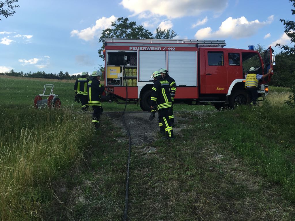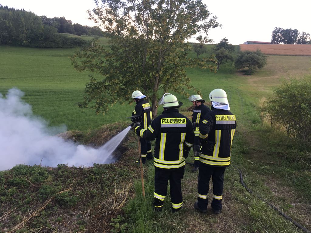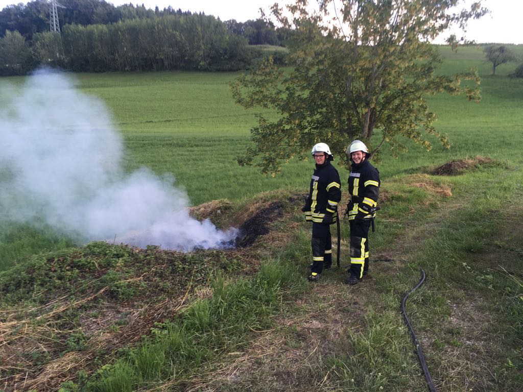 Nach der Erkundung durch Einsatzleiter Wolfgang Veit konnte ein unbeaufsichtigter brennender Heuhaufen aufgefunden werden.