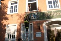 - Leitern hochsteigen ins 1. OG (zweiteilige Steckleiter zwei mal besteigen und den Rettungsknoten machen)