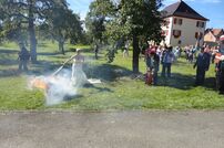 Im Namen der Feuerwehr graulierten unser Kommandant Wolfgang Veit und sein Stellvertreter Claus Preter dem frisch vermählten Ehepaar. Mit der Kübelspritze musste anschließend das Brautpaar ein brennendes Holzhaus löschen. Die Aufgabe wurde innerhalb kürzester Zeit bravourös gemeistert.