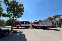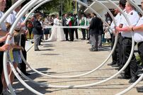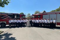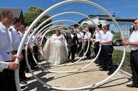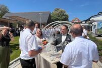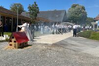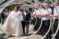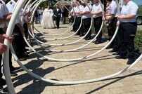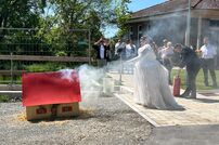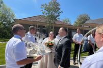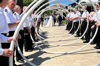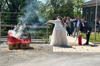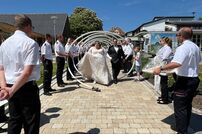 Gemeinsam mit der Werkfeuerwehr Takeda aus Singen, wurde das Brautpaar nach der Trauung von den Feuerwehrkameraden mit einem Schlauchspalier emfpangen. Als erste große Aufgabe als Ehepaar, mussten die beiden ein kleines Holzhaus mit der Kübelspritze löschen. Dies gelang ihnen mit der vorhandenen Löschwassermenge und Gruppenführer Patrick konnte nach dem Löscheinsatz „Brand aus!“ melden.