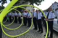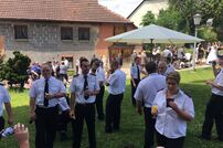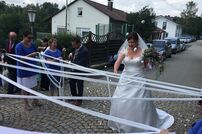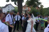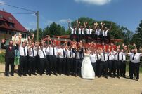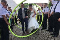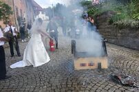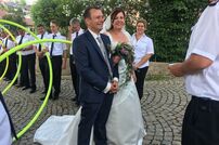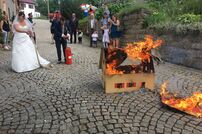 Im Anschluss an den Gottesdienst wurde das frisch vermählte Paar mit einem Schlauchspalier von den Kameradinnen und Kameraden empfangen. Nach der Gratulation durch Kommandant Wolfgang Veit und Stellvertreter Claus Preter mussten die beiden mit der Kübelspritze ein brennendes Holzhaus löschen. Unter dem Beifall der anwesenden Gäste war das Feuer rasch unter Kontrolle.