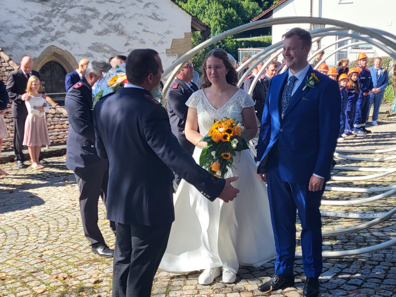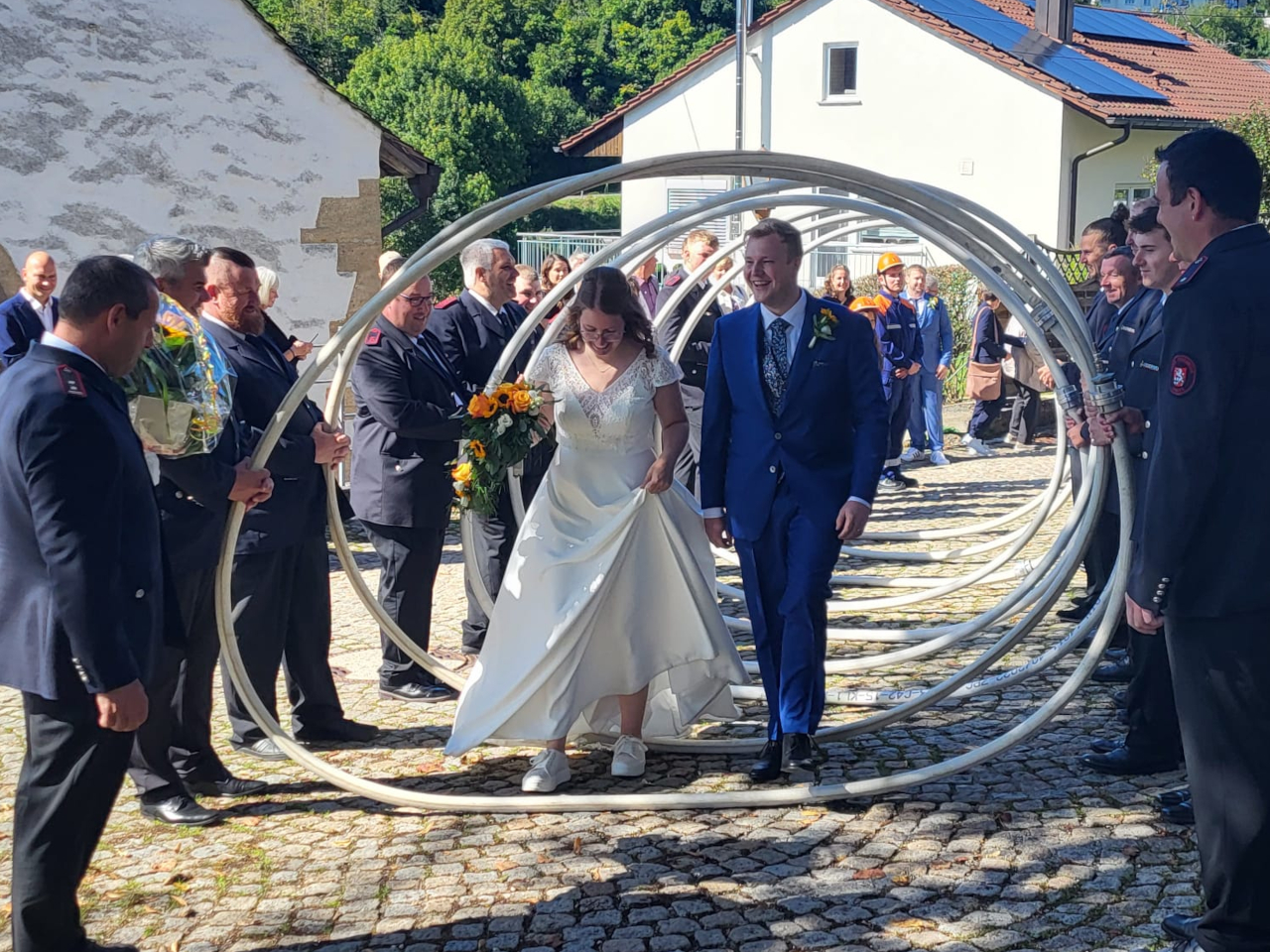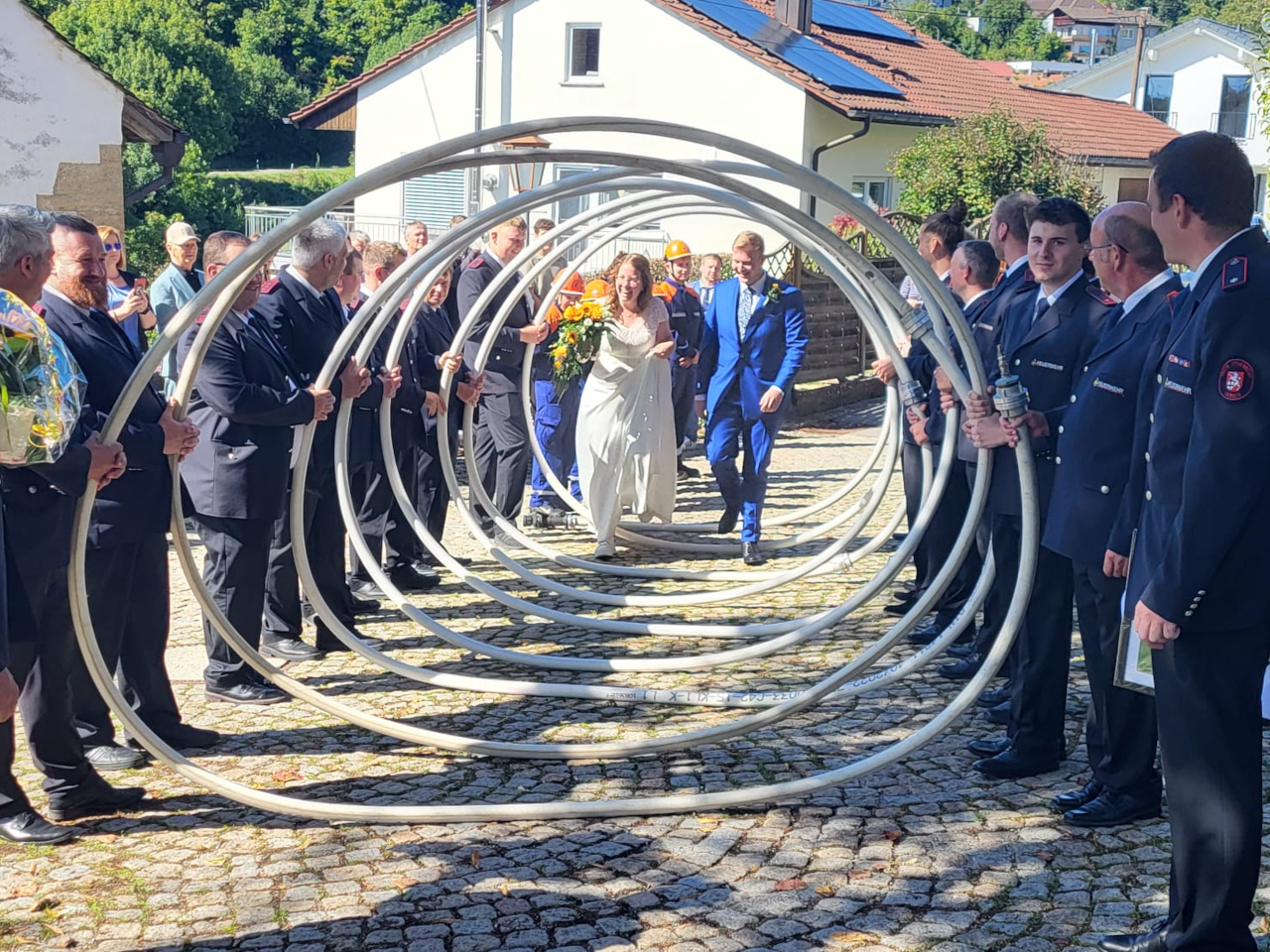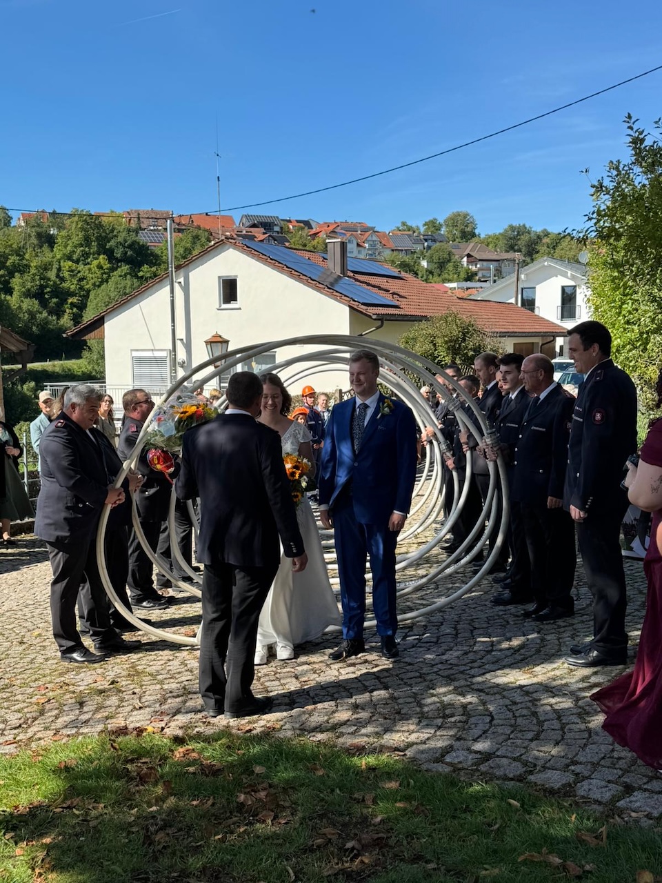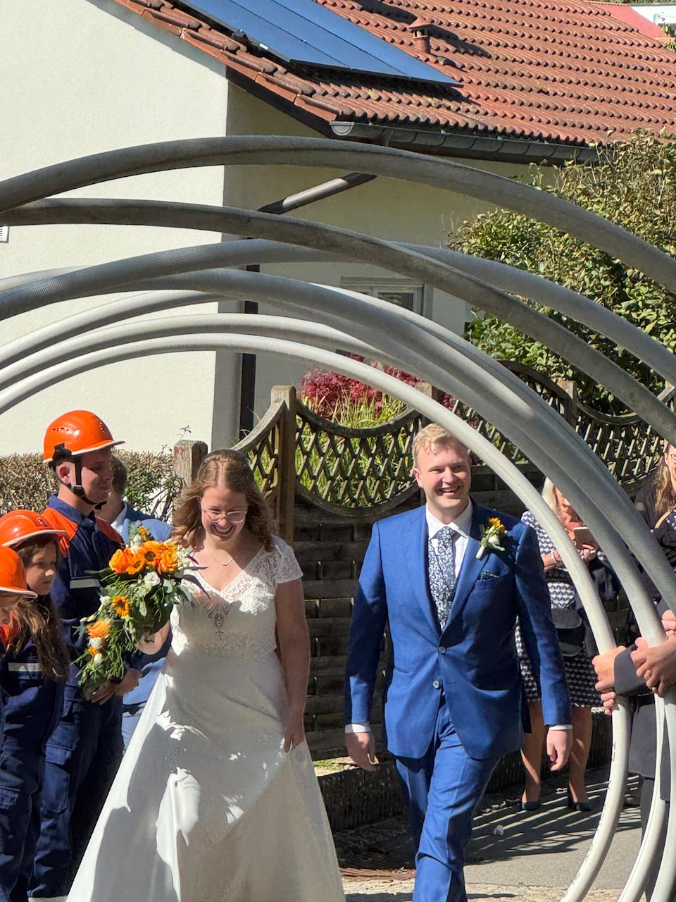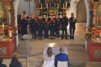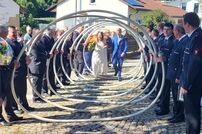 Im Anschluss an die Trauung wurde das frisch vermählte Paar mit einem Schlauchspalier von der Jugendfeuerwehr und den aktiven Kameraden empfangen. Für die Feuerwehr überbrachte der stellvertretende Kommandant Claus Preter die Glückwünsche, für die Jugendfeuerwehr gratulierte Jugendwart Simon Volk.