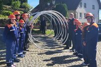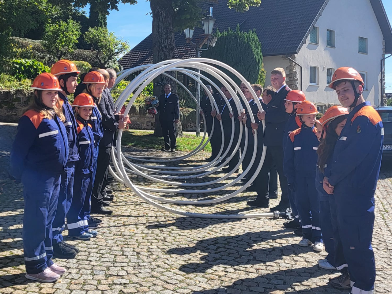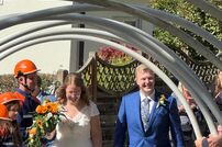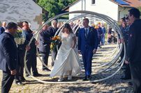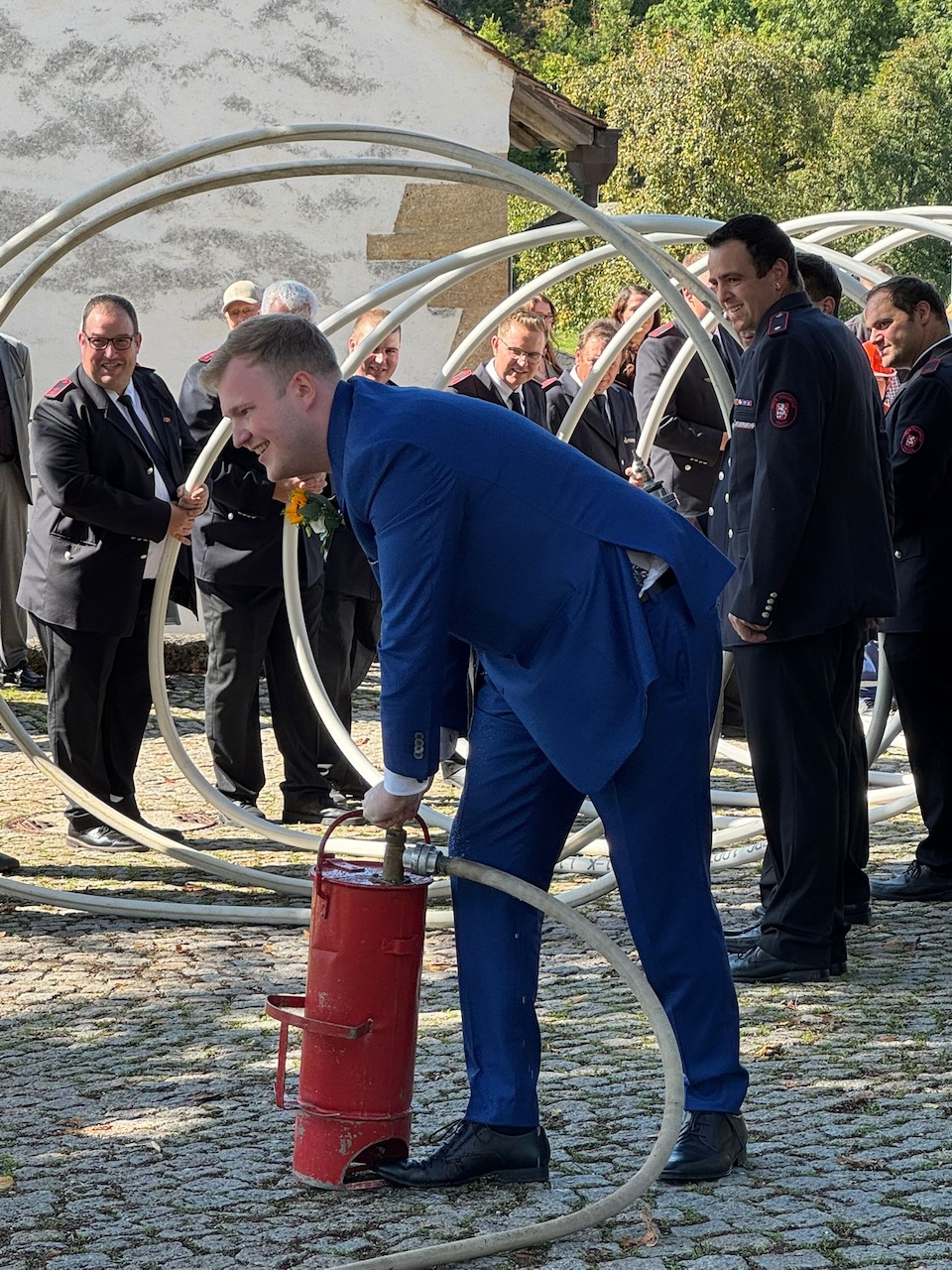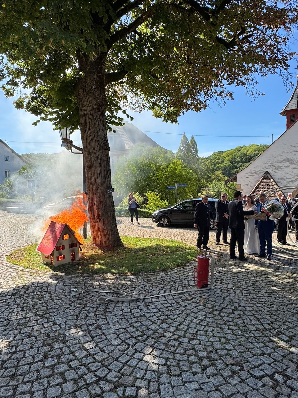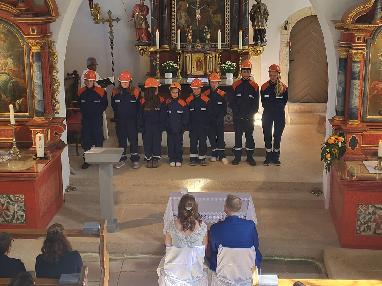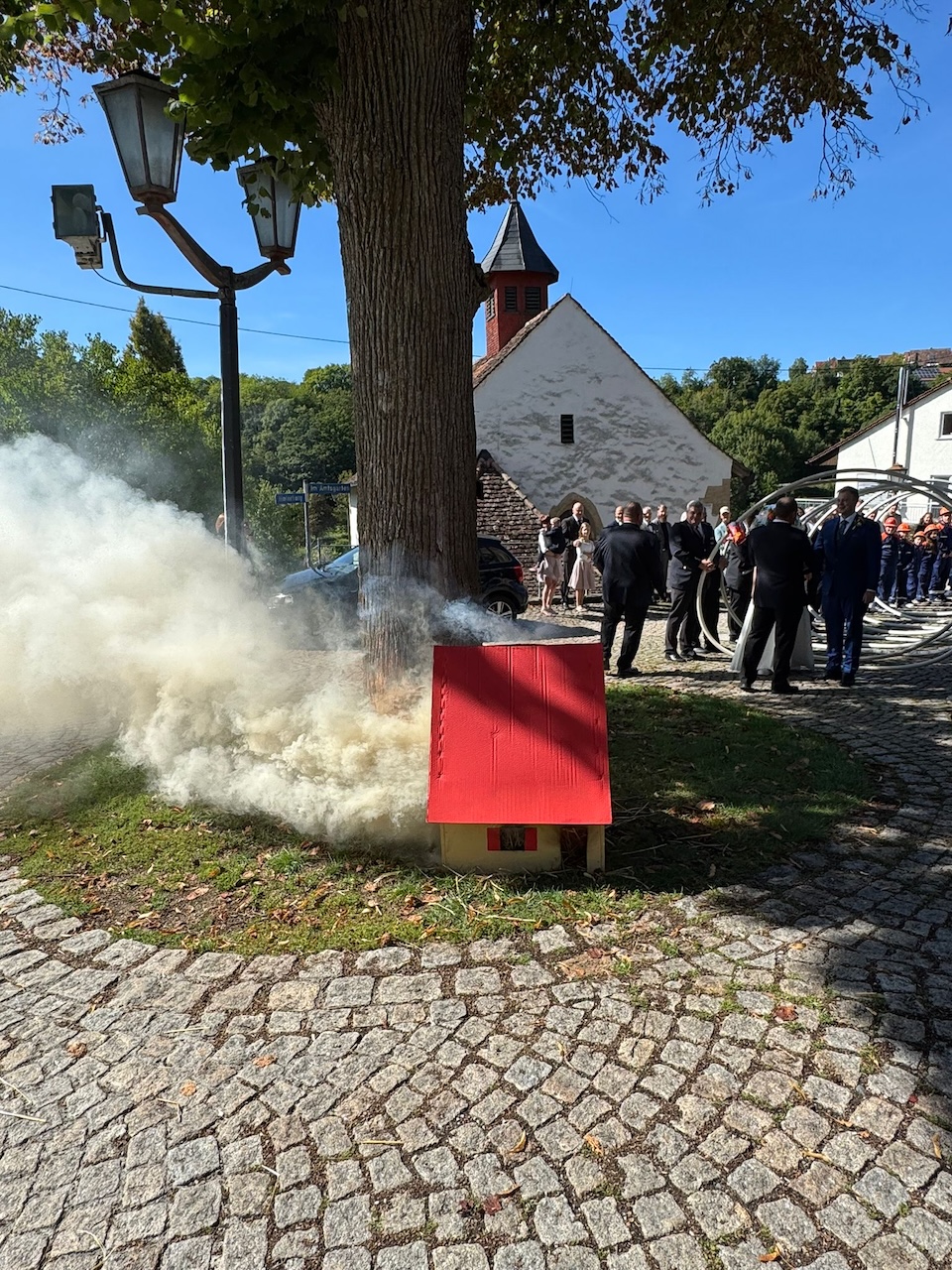 Im Anschluss an die Trauung wurde das frisch vermählte Paar mit einem Schlauchspalier von der Jugendfeuerwehr und den aktiven Kameraden empfangen. Für die Feuerwehr überbrachte der stellvertretende Kommandant Claus Preter die Glückwünsche, für die Jugendfeuerwehr gratulierte Jugendwart Simon Volk.