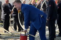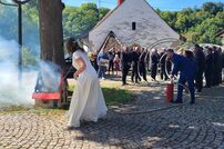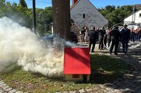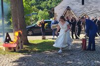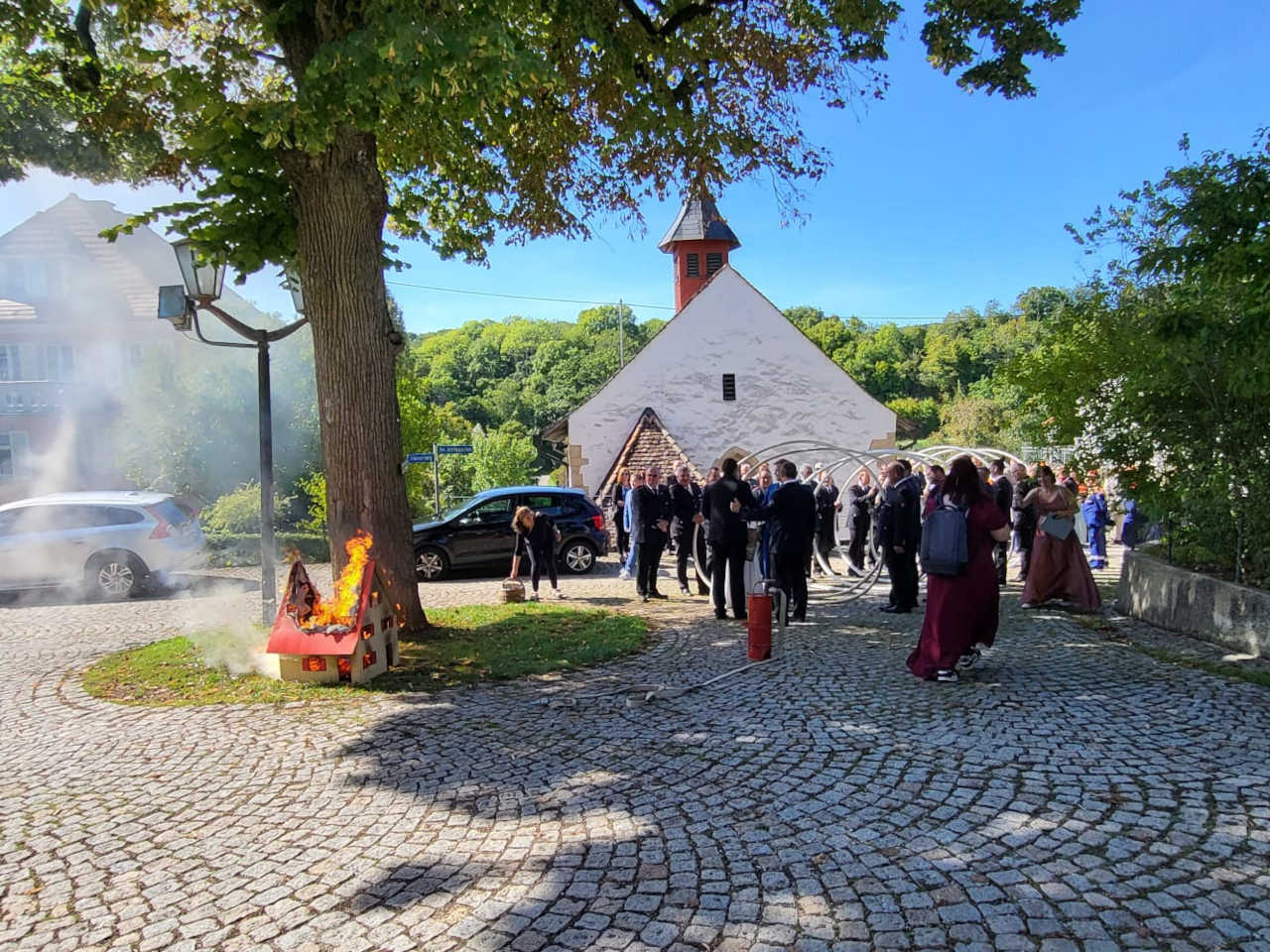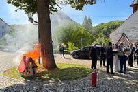 Im Anschluss musste das Brautpaar mit der Kübelspritze ein brennendes Holzhaus löschen – eine Aufgabe, die das frisch vermählte Ehepaar mit Bravour meisterte. Danach fand auf dem Vorplatz des Hinterburgturms ein Stehempfang statt.