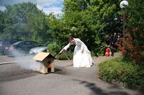 Für das frisch vermählte Brautpaar stellten sich nach der Traufeier die Kameraden und Kameradinnen der Feuerwehr zu einem Spalier auf. Zu den ersten Gratulanten zählte unser Stv. Kommandant Claus Preter, der den beiden im Namen der Feuerwehr Tengen herzlich gratulierte. Der anschließende Löscheinsatz wurde vom Brautpaar mit Bravour gemeistert.