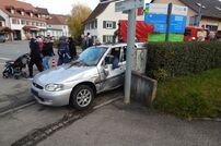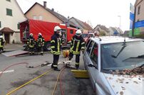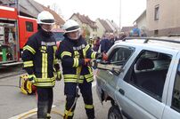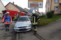 Während des Brandeinsatzes kam es an einer Kreuzung wegen überhöhter Geschwindigkeit eines PKWs zu einem Verkehrsunfall. Das Auto prallte gegen eine Gartenmauer, sodass der Fahrer eingeklemmt wurde. Mit Schere und Spreizer wurde die eingeklemmte Person befreit.
