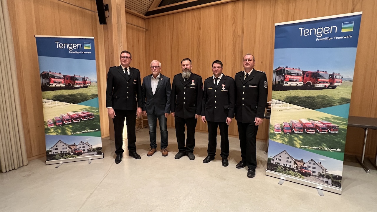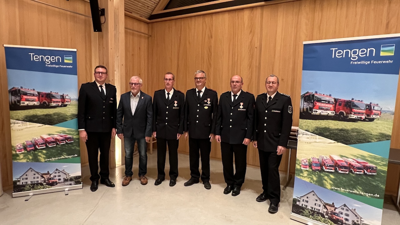 Bürgermeister-Stellvertreter Adelbert Zeller überreichte den Jubilaren ein Präsent der Stadt Tengen. Er sprach nach der Bildung und Ausstattung der Ausrückebereiche durch den aktuellen Feuerwehrbedarfsplan die Notwendigkeit der Fortschreibung für die anstehenden Ersatzbeschaffungen an und dankte der Feuerwehr für ihr ehrenamtliches Engagement sowie den unermüdlichen Einsatz für die Bürgerinnen und Bürger im Stadtgebiet.