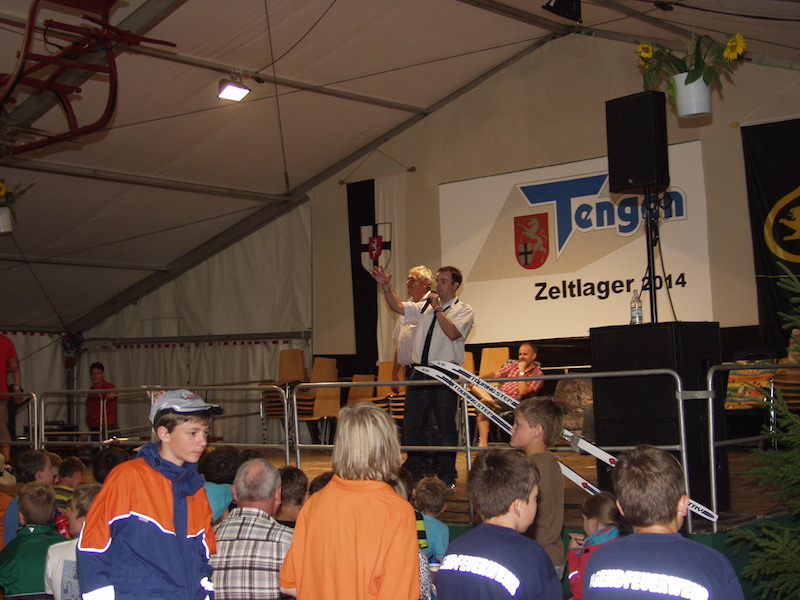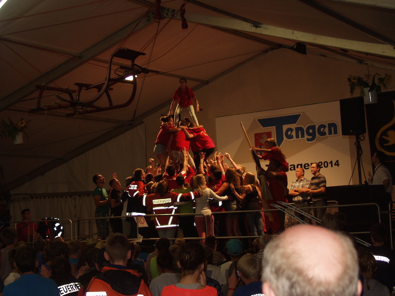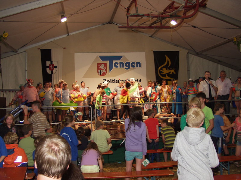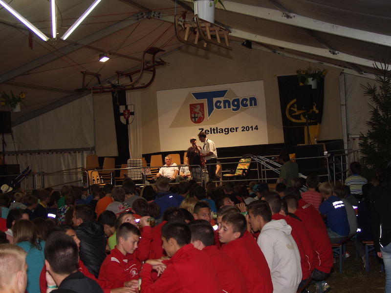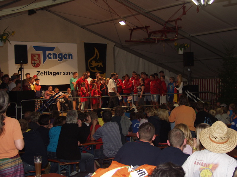Mit 50 Teilnehmern wurde die Wette leider verloren, aber wir hatten großen Spaß auf der Bühne. Als Wetteinsatz werden wir beim Zeltlager 2015 in Rielasingen unseren Dienst leisten.