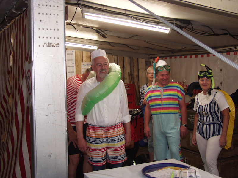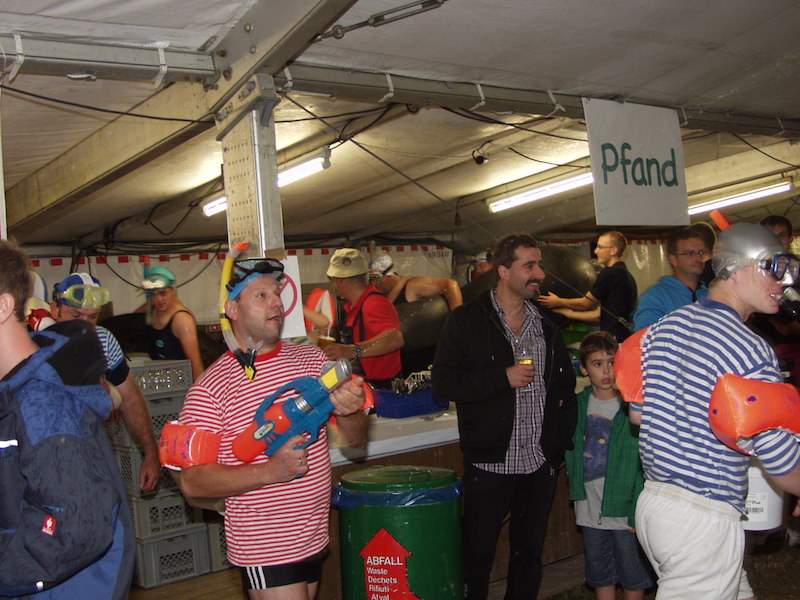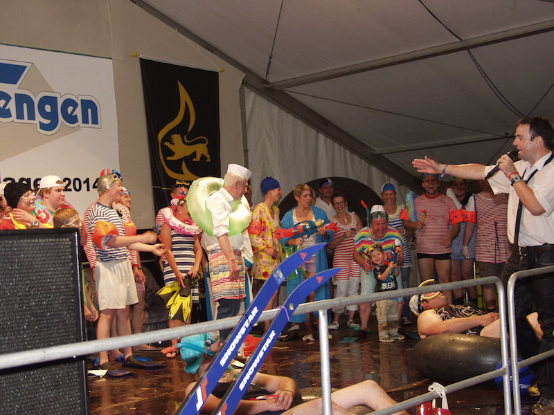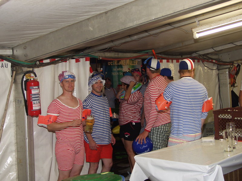 „Wir wetten, dass es Tengen nicht schafft, 100 Mitbürgerinnen oder Mitbürger aus Tengen und Ortsteilen in einem geringelten Badeanzug, mit Flossen, Taucherbrille, Schnorchel, Badekappe und Schwimmflügel oder Schwimmring bis 22:00 Uhr am Samstagabend auf das Lagergelände zu bekommen und gemeinsam den Ententanz auf dem Lagergelände zu tanzen.“
