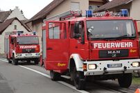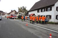 Nach Eintreffen des LF 8 aus Büßlingen rüstete sich der Angriffstrupp mit Atemschutz aus. Vom Wasser- und Schlauchtrupp wurde die Wasserversorgung aufgebaut.