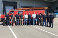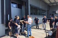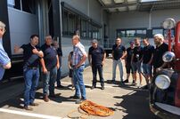 Ganz kurzfristig und für Thomas sehr überraschend, wurde er für Freitag Nachmittag zu einer Besprechung mit dem Geschäftsführer Christian Metz eingeladen. Als dann um 15.00 Uhr unser LF 15 Ts mit Ehefrau Hannelore auf dem Beifahrersitz, Blaulicht und Martinshorn um die Ecke fuhr, war die Überraschung perfekt. Nach der Verabschiedung von seinen Arbeitskollegen und seinem Chef übernahm die Feuerwehr das Kommando.