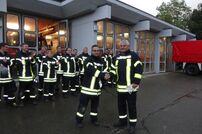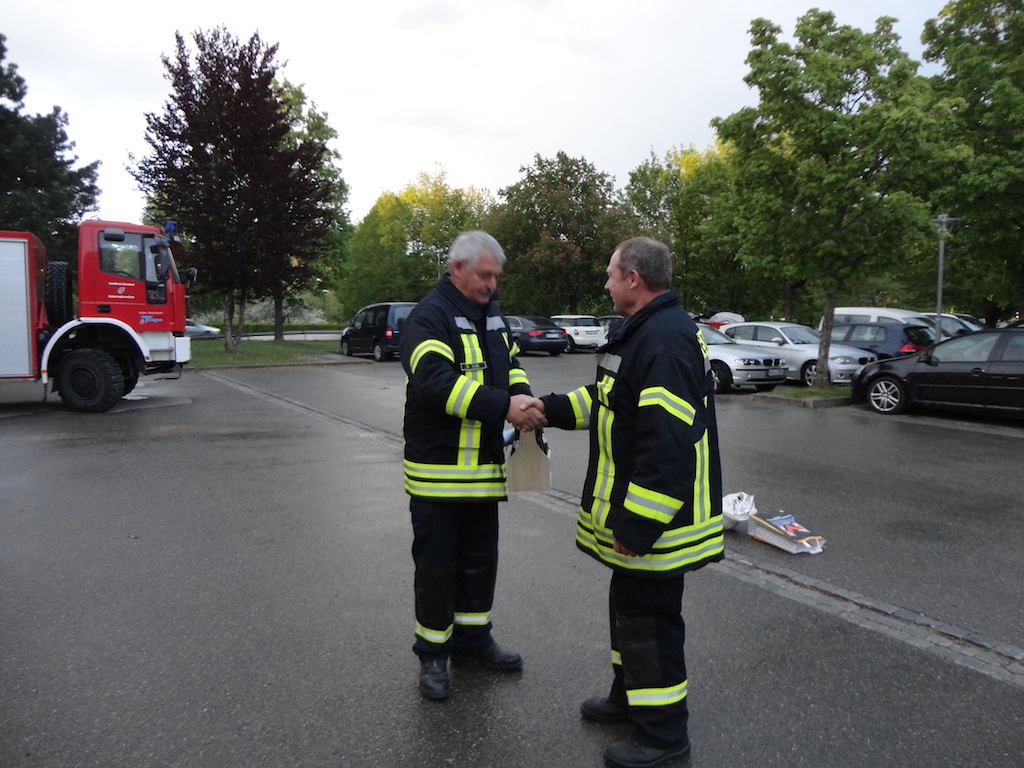 Nachdem die Mannschaft vor dem Feuerwehrhaus angetreten war, gratulierte Wolfgang Veit dem Kameraden Erwin Baier zu seinem sechzigsten Geburtstag und überreichte ihm als kleines Präsent eine Männerhandtasche.