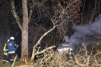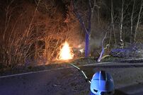 Er übersteuerte sein Fahrzeug auf das Bankett und prallte mit voller Wucht auf einen Baum. Durch den starken Aufprall drehte sich das Fahrzeug um ca. 180 Grad und kam dann in einer Hecke zum Stehen. Das Fahrzeug ging sofort in Flammen auf, der Fahrer konnte sich mit seiner zugezogenen Verletzung noch rechtzeitig aus dem Auto retten.