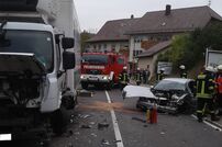 Zu einem schweren Verkehrsunfall wurde die Feuerwehr Tengen am Dienstag, den 09.10.18 gegen 10.30 Uhr alarmiert. Auf der B 314 kam am Ortsausgang von Blumenfeld in Fahrtrichtung Beuren a.R. ein PKW Lenker auf die Gegenfahrbahn und stieß mit einem entgegenkommenden Kühllaster zusammen.