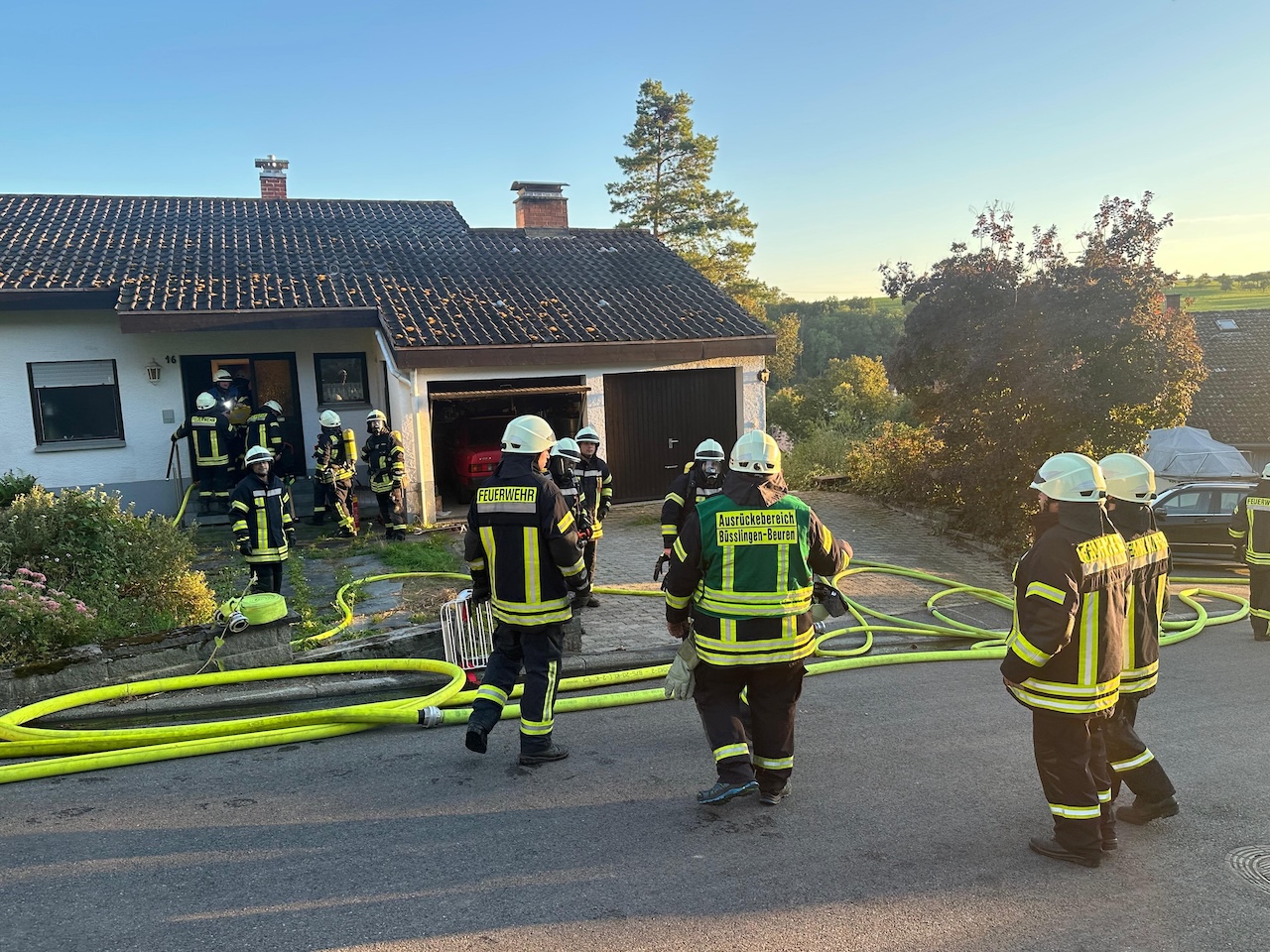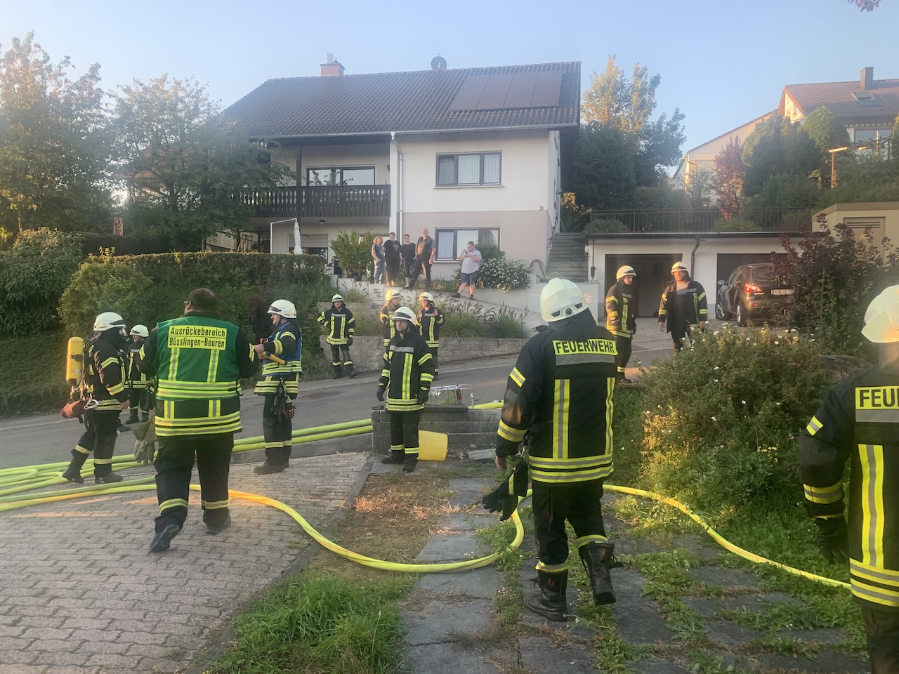 Am Freitagabend, dem 12. September, wurde die Feuerwehr Tengen, Abteilung Büßlingen, sowie die Abteilung Tengen um 18:43 Uhr per Vollalarm zu einem Brandeinsatz alarmiert. Ebenfalls alarmiert wurden die Führungsgruppe der Feuerwehr Tengen und die Drehleiter aus Thayngen. Der Alarm erfolgte über Meldeempfänger. Einsatzort war die Waldstraße in Beuren am Ried. Die Integrierte Leitstelle (ILS) Radolfzell meldete ein Einsatzstichwort „B3 – Rauch aus Gebäude“ nach mehreren Notrufen.