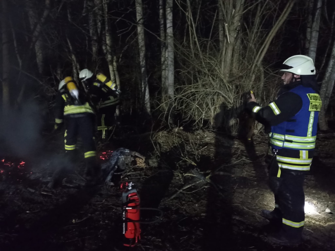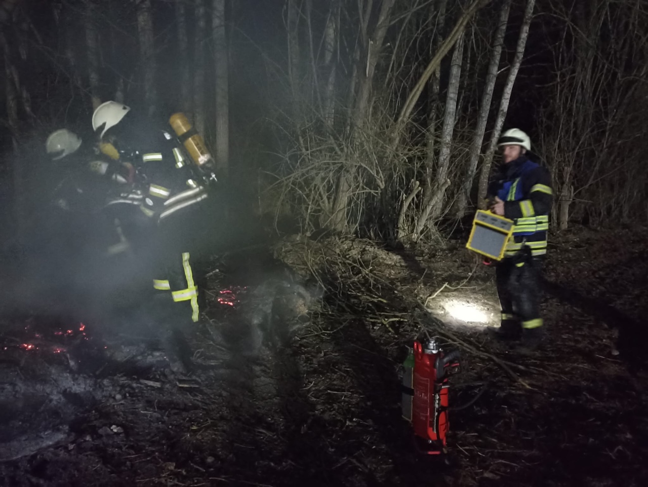 Die Einsatzkräfte führten eine sofortige Erkundung durch. Dabei konnte schnell festgestellt werden, dass es sich um ein glimmendes Reisigfeuer handelte, das sich nicht weiter ausbreitete. Um eine Gefährdung durch Rauchentwicklung und mögliche Ausbreitung des Feuers zu verhindern, wurde das Feuer mit einem Kleinlöschgerät abgelöscht.
