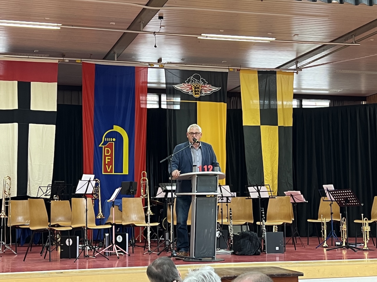 In seiner Ansprache erläuterte der stellvertretende Kreisbrandmeister Hannes Oexl die Entstehung der Notrufnummer 112. Viele der Anwesenden erinnern sich noch, dass ein verlässlicher Notruf früher keine Selbstverständlichkeit war. Erst durch das Engagement der Björn-Steiger-Stiftung wurde die Nummer 112 im Jahr 1973 bundesweit eingeführt.