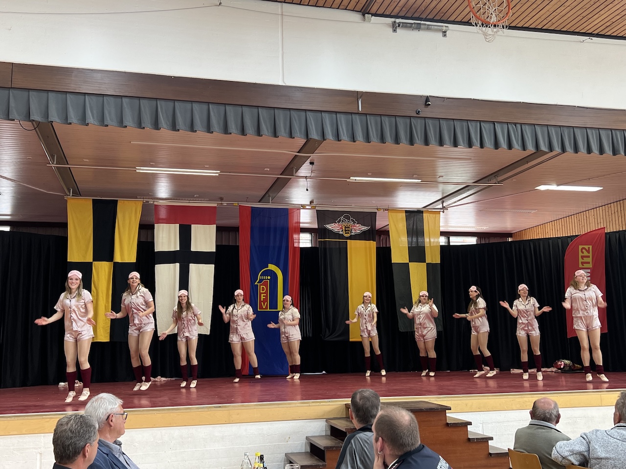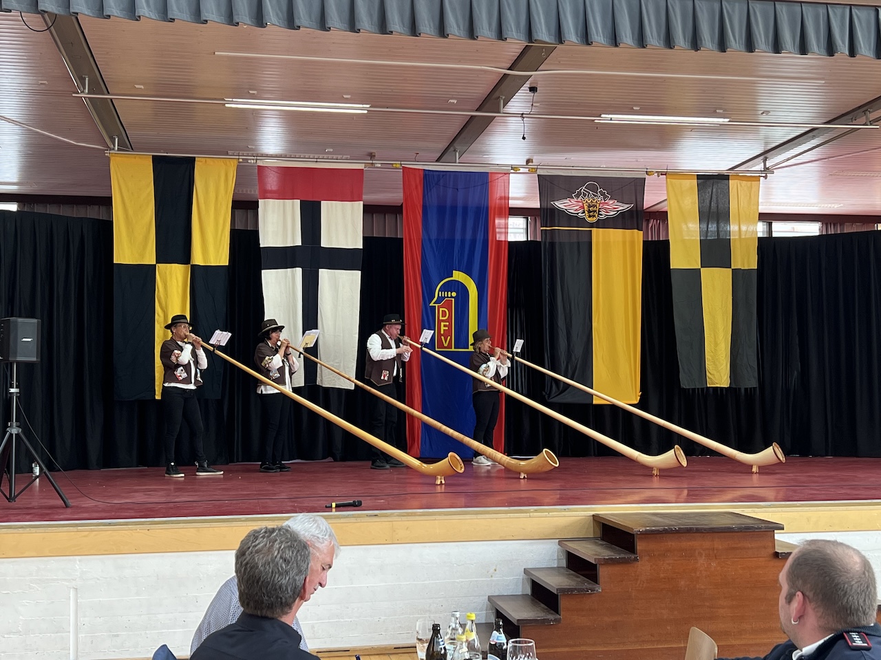 Nach den Grußworten erwartete die Gäste ein unterhaltsames Programm. Ein Tanz der Garde in Pyjamas sorgte für viel Aufmerksamkeit, und ein Auftritt von vier Alphornbläserinnen und -bläsern mit ihren traditionellen Instrumenten wurde zu einem musikalischen Höhepunkt. Gleichzeitig blieb ausreichend Zeit für Gespräche und das Wiedersehen mit Kameraden aus der eigenen sowie aus anderen Wehren, mit denen man viele Jahre im Feuerwehrdienst verbracht hatte.