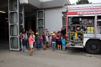 Zuerst wurde den Kinder gezeigt wie ein Feuerwehrmann ausgerüstet ist, danach ging es zu den Löschfahrzeugen wo die verschiedenen Geräte erklärt und auch ausprobiert werden konnten. Nach dieser kurzen Einführung in die Feuerwehrtechnik, teilte man die Kinder in 5 Gruppen auf und sie mussten im Team 4 Stationen durchlaufen und ihr Geschick unter Beweis stellen.
