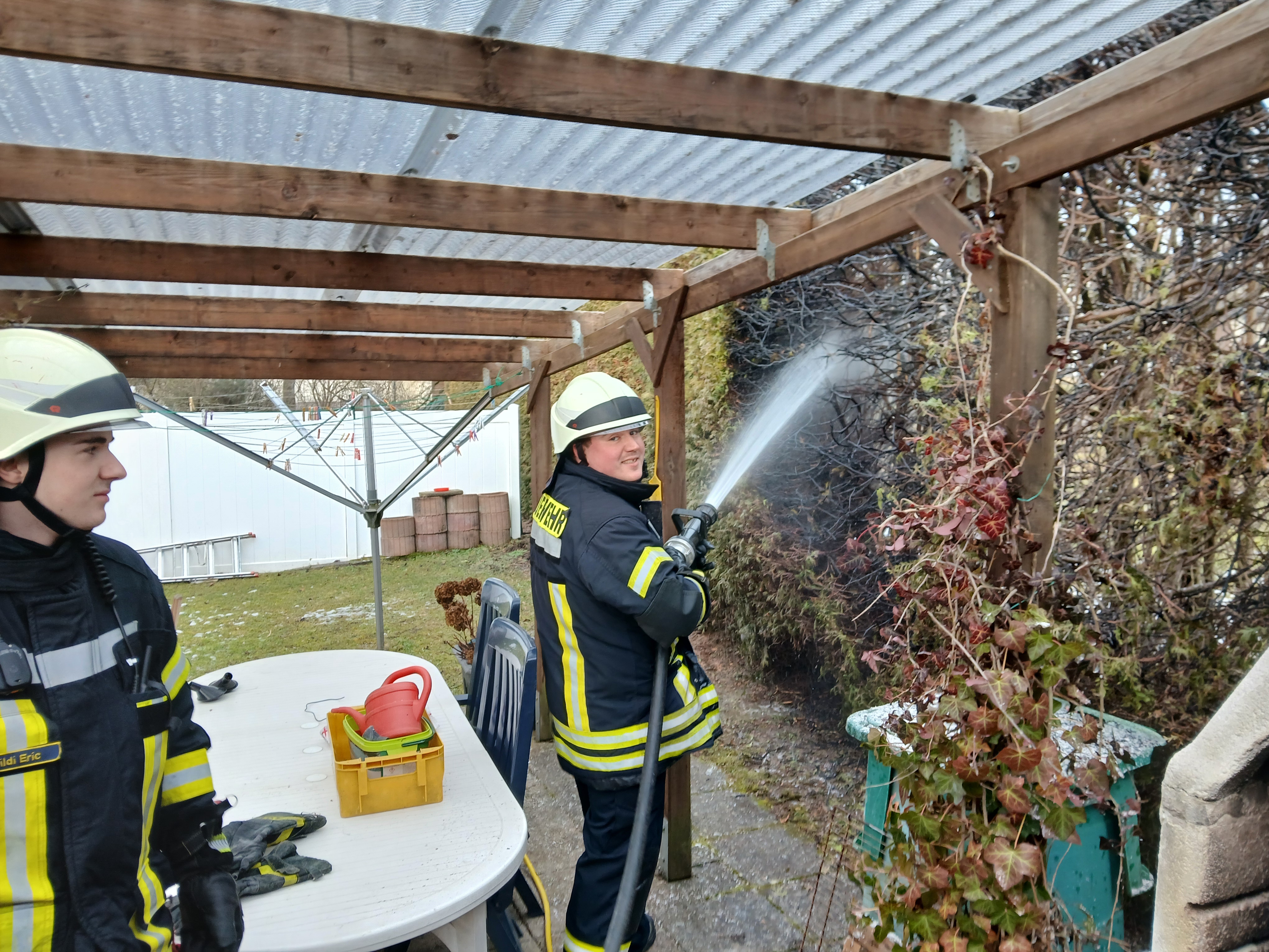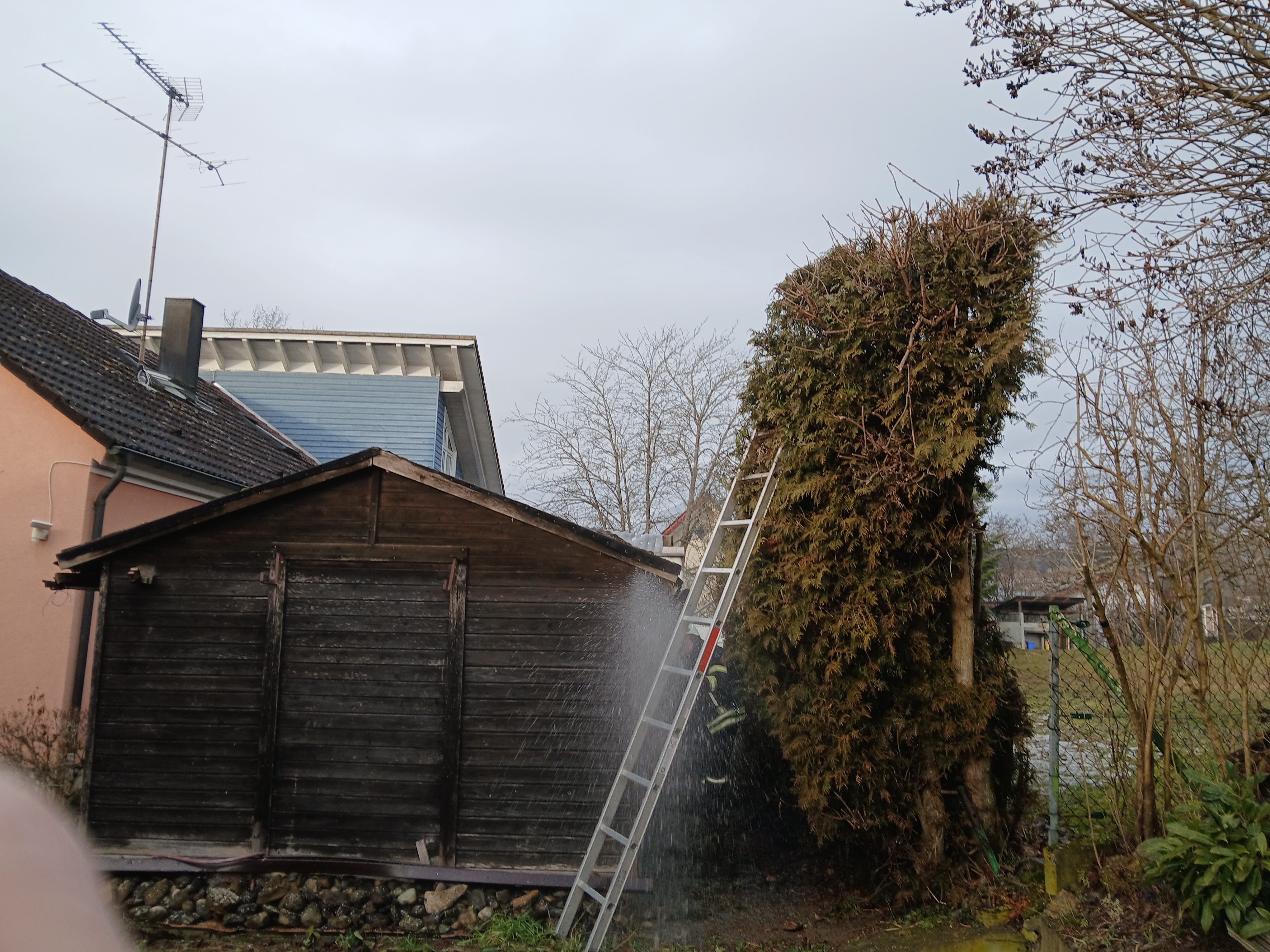 Beim Eintreffen an der Einsatzstelle brannte eine zirka 15 Meter lange Thuja-Hecke. Dank des schnellen Eingreifens aufmerksamer Nachbarn, die das Feuer bereits mit einem Gartenschlauch eingedämmt hatten, konnte eine weitere Ausbreitung verhindert werden.