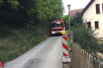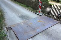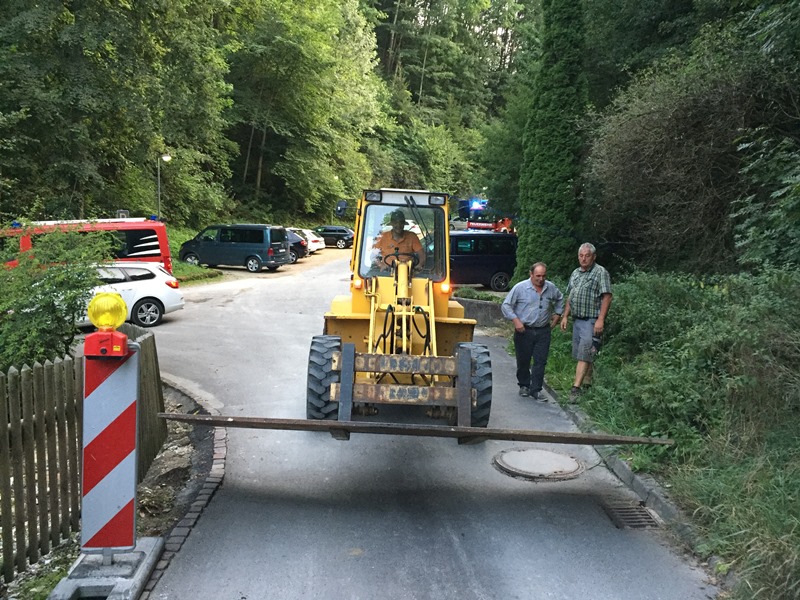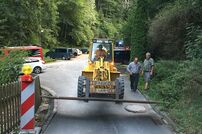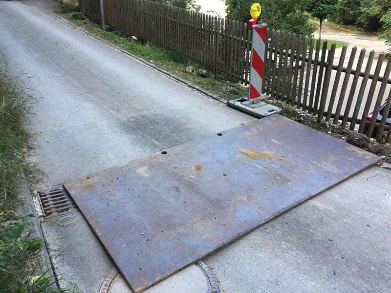 Damit die Zufahrt weiterhin gefahrlos passierbar ist, wurde mit dem Radlader des städtischen Bauhofs eine Stahlplatte an die Einsatzstelle transportiert und darüber gelegt.