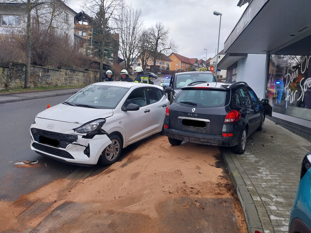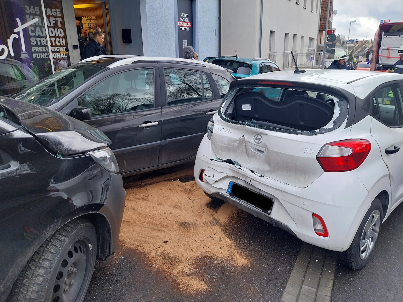 Beim Eintreffen an der Einsatzstelle in der Marktstraße zeigte sich folgende Lage: Ein VW-Bus hatte aus ungeklärter Ursache mehrere auf dem Parkstreifen abgestellte Fahrzeuge touchiert und diese einige Meter zusammengeschoben.