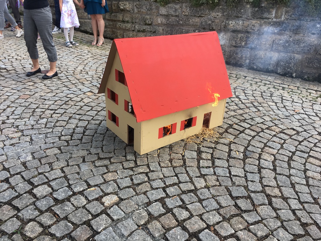 Im Anschluss an den Gottesdienst wurde das frisch vermählte Paar mit einem Schlauchspalier von den Kameradinnen und Kameraden empfangen. Nach der Gratulation durch Kommandant Wolfgang Veit und Stellvertreter Claus Preter mussten die beiden mit der Kübelspritze ein brennendes Holzhaus löschen. Unter dem Beifall der anwesenden Gäste war das Feuer rasch unter Kontrolle.