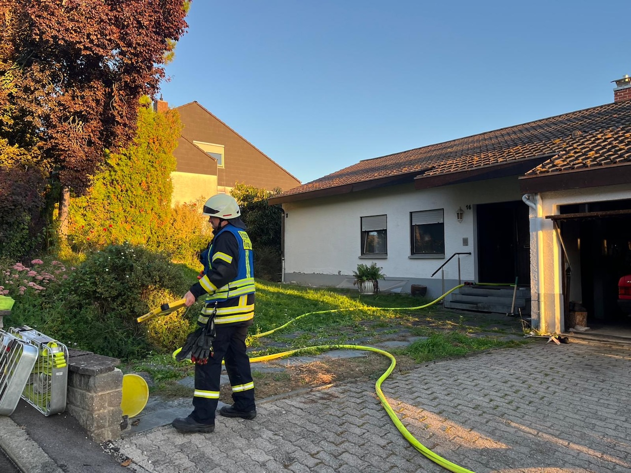 Beim Eintreffen des ersten Fahrzeugs der Abteilung Büßlingen mit dem Einsatzleiter vor Ort ergab die Erkundung eine starke Verrauchung im Gebäude, zudem waren Rauchwarnmelder deutlich hörbar. Da das Fahrzeug des Hausbesitzers in der Garage stand, konnte nicht ausgeschlossen werden, dass sich dieser oder weitere Personen noch im Gebäude befanden.