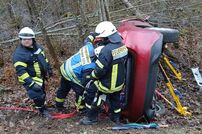 Beim Eintreffen an der Einsatzstelle lag ein PKW abseits der Straße im Wald, auf der Seite liegend und mit dem Dach an einen Baum gedrückt. Eine Person befand sich noch im Fahrzeug und war nicht in der Lage, sich eigenständig zu befreien.